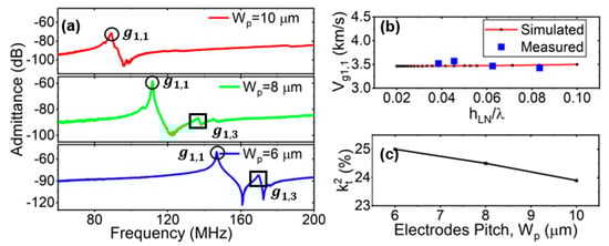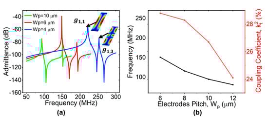 (a) Simulated admittance with different Wp settings of 4 µm, 6 µm, and 10 µm, respectively, and (b) simulated frequency of and coupling coefficient with the changes in electrode pitch , while N = 2, hLN = 0.75 µm, L = 100 µm, he = 0.2 µm, and We/Wp = 50%.