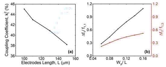 Simulated (a) coupling coefficient of with the changes in electrode length , while N = 2, hLN = 0.75 µm, Wp = 10 µm, he = 0.2 µm, and We/Wp = 30%; (b) and with the changes in Wp/L.