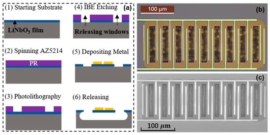 Figure 6a shows the fabrication process of the LiNbO3-film resonator for SH0 modes. Firstly, a 36Y-cut LiNbO3 film 0.75 μm in thickness was transferred onto a high-resistivity Si wafer. The film was procured from Fluoroware (now part of Entegris). Before the ion-beam etch (IBE) process, hard baking (115 °C for 10 min) was performed on the AZ5214 to harden the photoresist (PR) to serve as the mask for the etching of the LiNbO3.