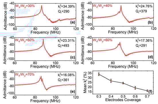 Five electrodes’ coverage values were investigated, and the respective Qr values were recorded (Figure 9a–e). The relationship between device We/Wp and Qr is still under investigation []. Figure 9f illustrates the comparison between the values of the measured mean electromechanical coupling under different degrees of electrode coverage We/Wp. All had similar trends, in that smaller electrode coverage led to larger values. The mean values varied from 33.9% to 16.1%, with the We/Wp increasing from 0.3 to 0.7.