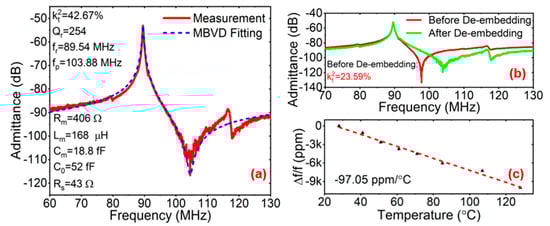 The of the resonator can be calculated by identifying fr and fp using Equation (5), in line with common practice. The can be alternatively extracted by fitting the measured admittance with the MBVD model (Figure 7d) []. The model consists of the static capacitor C0, the motional resistor Rm, the motional inductor Lm, the motional capacitor Cm, and the series resistance (Rs). The Rs shows the resistance of the pads and electrodes, which is measured from test structures with shorted fingers []. The Rm represents the actual energy dissipation in a resonator. The Lm and Cm represent the interchangeable mechanical energy storage in a resonator, which can be expressed by referring to []. The quality factors (Qr) can be expressed as follows [,,,]: