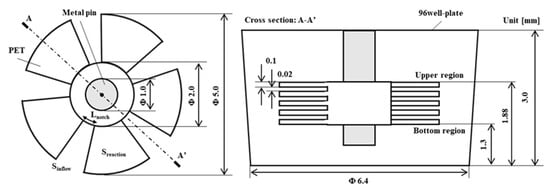 For the enhancement of convection during the unstable rotation of the structure, a notched shape was proposed. Figure 2 shows the dimensions of the proposed 3D-stack with notches, consisting of five 100 μm thick PET films (Polyester Film Lumirror™ (Toray Industries, Inc., Tokyo, Japan) stacked in intervals of 20 μm to 100 μm and a fan-shaped notch applied to the disc film. In order to minimize the reduction of the reaction field area and to maintain mechanical strength, a fan shape that was cut in the normal direction was used. In the notch shape, a metal pin with a radius of 0.5 mm was penetrated to the center to stabilize the rotation in order to allow the circumferential flow from the notch to flow in. The dimensions of the wells were based on the drawings of the ELISA plate 96F S (MS-8496F, Sumitomo Bakelite Co., Ltd., Tokyo, Japan). The notch-shaped 3D-stack is referred to as 3D-stack (N), and the annular-shaped 3D-stack shown in Figure 1 is referred to as 3D-stack (C). The notch-shaped films with a diameter of 5 mm were punched from a PET sheet and then stacked at a regular interval after dowel processing for keeping the interval between the films. The 3D-stack structure was fabricated automatically by using micro-press forming equipment developed by the authors [].