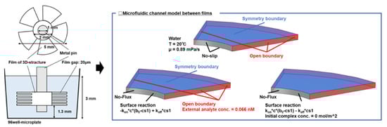 In this study, the biomolecular transport analysis includes not only flow but also advection–diffusion equations and antigen–antibody reactions, and a time-dependent analysis was used. As boundary conditions, the wall surface was set to be non-slipping, and an open boundary was defined at the boundary between the container and the film, where fluid flows in and out between the films. The open boundary is the boundary where the fluid is in contact with a large amount of fluid, and the normal stress is 0 N/m2. In addition, in order to reduce the computational load, the symmetry boundary was defined, and the number of elements was reduced. Next, the inflow concentration was always constant at 0.066 nM with respect to the open boundary. This corresponds to 10 ng/mL of Human IgA used in the experiment. The numerical values of the parameters used in the analysis are summarized in Table 1. The surface density of the captured antibody and the diffusion coefficient of the antigen antibody were chosen in reference to the paper by Nygren et al. [,,].