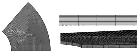 Furthermore, since the circumferential flow is a flow caused by inertia, it is expected that the circumferential flow will be improved by the change in Reynolds number due to the stacking interval. Therefore, a total of five geometries, namely 20, 40, 60, 80, and 100 μm, were created as lamination spacing. A mesh was created with hexahedral elements (Figure 4). To evaluate the influence of mesh size, the thickness (axial direction) of the mesh was changed to 10, 5, 2.5, 1.25, and 0.625 μm, and the concentration of antigen–antibody conjugates on the surface of the film was evaluated as a feature. As a result, the value stabilized at 2.5 μm or less. Therefore, the mesh size was set to 1.25 μm, and the mesh was created (Table 2). The PC for analysis was a Precision 7920 (DELL Inc., Round Rock, TX, USA), and the CPU was Intel®. Xeon® Gold 5218R (20 cores, 2.10 GHz), 12 slots of 8 GB DDR4, 96 GB in total.