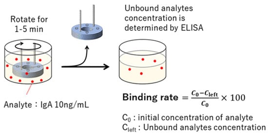 The structure was rotated in a solution containing 10 ng/mL of IgA for 1~5 min, and the concentration of unreacted IgA remaining in the solution was quantified by a sandwich ELISA, using a 96-well plate. Then, the binding rate to the 3D-stack was calculated by subtracting the concentration of unreacted IgA from the initial concentration (Figure 5). The procedure used was the same as the one used in a previous study []. This was repeated twice, and the average value was used, which was evaluated by comparing the 3D-stack (N) and 3D-stack (C) (Table 3).