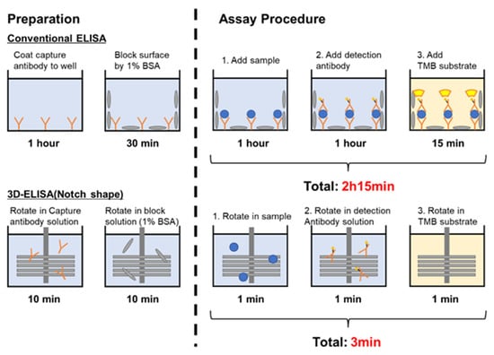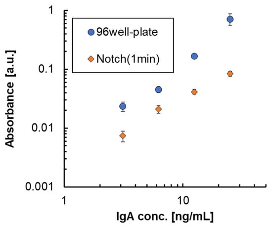 The procedure for ELISA is shown as follows. Anti-Human IgA (Bethyl Lab., Inc., Montgomery, TX, USA) was diluted 100-fold with 0.05 M carbonate–bicarbonate (pH = 9.5) into new wells, and the 3D-stack was inserted into 100 μL increments for 10 min and rotated for 10 min. After incubation, the 3D-stack was transferred to a new well, and the wash solution (50 mM Tris, 0.14 M NaCl, 0.05% Tween20, pH 8.0) was dispensed into the new well—i.e., 100 μL of each inserted into the well—and rotated for 20 s. This was repeated 5 times. For blocking, 100 μL of blocking solution (50 mM Tris, 0.14 M NaCl, 1% BSA, pH 8.0) was dispensed into new wells, 3D-stack was inserted into the wells, rotated for 10 min, and washed. After blocking, Purified Human IgA (Bethyl Lab., Inc., Montgomery, TX, USA) was diluted with 50 mM Tris, 0.14 M NaCl, 1% BSA, and 0.05% Tween20, pH 8.0, and we dispensed 100 μL into new wells; and 3D-stack was inserted into the wells, rotated for 1 min, and washed. Next, HRP Anti-Human IgA (Bethyl Lab., Inc., USA) was diluted with 50 mM Tris, 0.14 M NaCl, 1% BSA, and 0.05% Tween20, pH 8.0, and we dispensed 100 μL into new wells; 3D-stack was inserted into the wells, rotated for 1 min, and washed. Finally, TMB One-Component HRP Microwell Substrate (Bethyl Lab., Inc., USA) was dispensed in the new well in 100 μL increments, and then a 3D-stack was inserted into the wells and rotated in a darkroom for 1 min. Thereafter, the 3D-stack inserted into the well with the TMB solution was removed, and 100 μL of Stop Solution (0.12 N HCl, Sera Care., Inc., Milford, MA, USA) was dispensed into the wells. The well was inserted into a plate reader (Tecan Group Ltd., Mannendorf, Switzerland) and was measured at a wavelength of 450 nm and a reference wavelength of 620 nm. The reagent used was based on a previous study. In processes of ELISA, the rotation speed used was also 2000 rpm, but for the unsteady rotation, the condition for the transient rotation is 1 s rotation, 0.1 s stop, and acceleration and deceleration at 0.1 s each, as proposed in the previous study []. For conventional ELISAs using only 96-well plates, we used the protocol provided by the manufacturer (Human IgA ELISA Quantitation Set, catalog no. E80-102, Bethyl Laboratories, Inc.). The incubation time was 1 h for the capture antibody, 30 min for blocking, 1 h for the sample, 1 h for the detection antibody, and 15 min for TMB. Figure 6 shows the ELISA using the 3D-stack and the ELISA using the plate in comparison with the conventional ELISA using only a well.