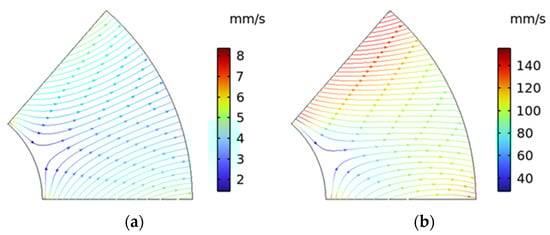 Streamline and velocity color map: (a) 20 µm and (b) 100 µm.