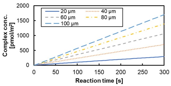To evaluate the biomolecule transport state and the surface reaction state between films, the time change in the antigen–antibody complex concentration for the reaction time of 5 min is shown in Figure 9. From Figure 9, it was confirmed that the composite concentration increased by increasing the stacking interval, and that the disadvantage of increasing the diffusion distance was not dominant in the range of 100 μm. This is due to the concentration diffusion layer formed by the reaction. The thickness of the concentration diffusion layer varies depending on the reaction field area, flow velocity, and flow path width [,]. Figure 10 shows that the concentration diffusion layer of the analyte concentration formed by the surface reaction was extracted from the two planes shown in Figure 7. In Figure 10, the analyte concentration was divided by the initial concentration, and the height of the XY plane was 10 µm from the film surface. The film interval of 20 μm has a larger area with a lower concentration than other stacking intervals. In addition, it was confirmed that the radial flow was inhibited, and the area effective for the reaction was reduced because the central axis was closed by a metal pin in the notch shape. For the use of the 3D-stack, a stacking interval and rotation speed to make Re greater than 1 could be necessary for the formation of circumferential flow, and it is necessary to secure an inlet that does not impede the radial flow and circumferential flow. As a result, it is effective to secure the inlet by providing a notch.
