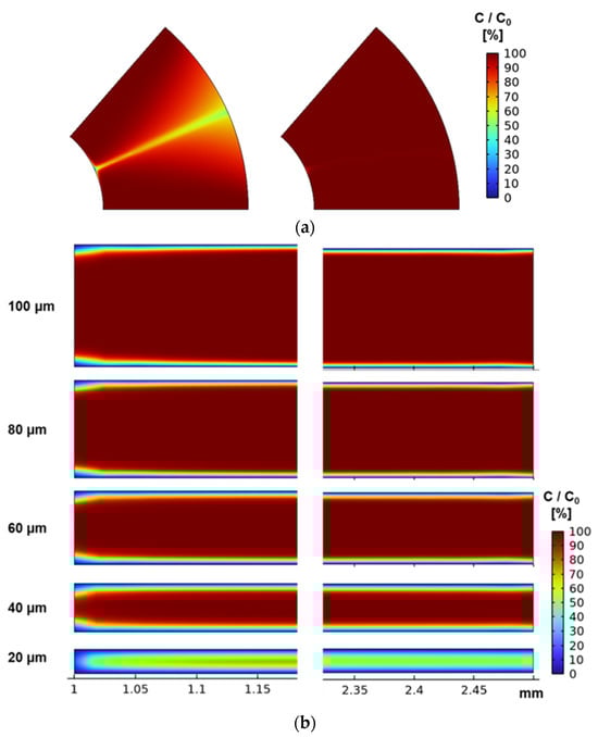 Analyte concentration distribution between films in each plane. (a) Analyte concentration distribution in the XY plane (left: 20 μm, right: 100 μm). (b) Analyte concentration distribution in the YZ plane.