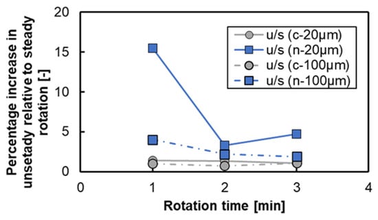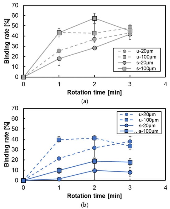 Variation in the binding rate for each shape: (a) for annular shape with intervals of 20 μm and 100 μm, and (b) for notched shape with intervals of 20 μm and 100 μm. u, unsteady rotation; s, steady rotation.