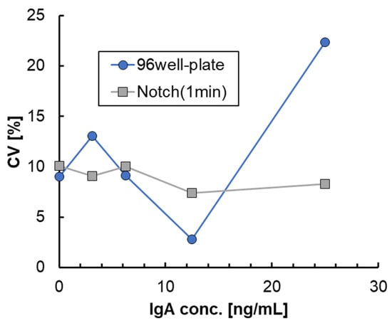 Based on results of the binding rate, which almost reached saturation by unsteady rotation of 1 min using the 3D-stack with film interval of 100 μm, we decided to shorten the time for each step of the ELISA test to 1 min. Therefore, in the ELISA process shown in Figure 6, the preparation process was under the same conditions as before, and only the time, n, for each process in the assay process was set to 1 min. Figure 13 shows the absorbance of ELISA at each concentration when the 3D-stack (N) of the lamination interval is 100 μm in comparison with that using a 96-well plate. In this case, the number of laminates is three for the 3D-stack (N). The coefficients of variation in the absorbance result for each condition of ELISA are shown in Figure 14. The coefficients of variation for 3D-stack are lower than 10% and similar to those of the 96-well plate. In all concentrations, the absorbance of the plate was higher than that of the 3D-stack (N), and the difference was larger at the higher concentration, but the difference was reduced at s lower concentration, and the blank value of the 3D-stack (N) was almost the same as that of the 96-well plate. This is because, at low concentrations, the concentration gradient is small, and the binding rate due to diffusion decreases in the case of the 96-well plate, but in the 3D-stack (N), the thickness of the concentration diffusion layer formed by the reaction is reduced by convection promotion, and the diffusion promotion by transient rotation is increased. However, at higher concentrations, the concentration gradient was larger, and diffusion became dominant, and the amount of binding in the 96-well plate, which took sufficient time for the reaction, was high, and the amount of binding in the 3D-stack (N) with a short reaction time was reduced. The point to emphasize is that, for 96 wells, the reaction time for each process is 1 h, while for the 3D-stack (N), it is 1 min. In other words, even though the time required for ELISA using a 3D-stack is reduced to 1/60, the reaction sensitivity is almost the same as that for 96 wells at low concentrations. This result is sufficient for practical use.