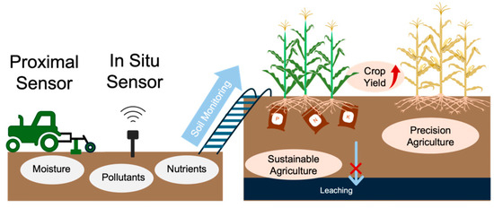 The success of agricultural production hinges on the decisions and practices of farmers and land managers worldwide. This is true across scales, from small-scale subsistence farming to large industrial operations, with both navigating challenges posed by nature and market fluctuations [1]. Monitoring soil conditions (e.g., moisture, nutrients, and pollutants) over growing seasons enhances resource efficiency, ultimately leading to maximized agricultural yields while simultaneously minimizing environmental impacts, as shown in Figure 1. Furthermore, long-term field observations of soil conditions along with crop yield, weather records, and management practices contribute to the databases that elucidate the intricate relationships between plant growth and environmental conditions. Data-enabled insights can further improve the mechanistic modeling of crop responses to climate change [2], breeding for stress-tolerant varieties [3], and the advancement of intelligent and sustainable automated agricultural systems [4].