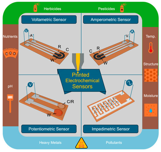 Printed technologies enable electrochemical sensors for soil monitoring, showcasing their versatility and potential in soil sensing applications. W denotes for working electrode, R stands for reference electrode, and C represents counter electrode.