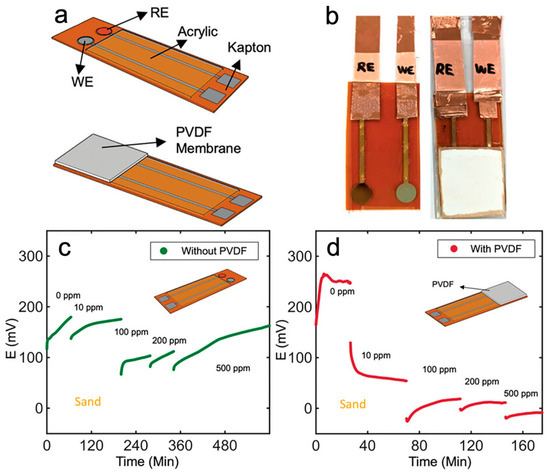 Printed potentiometric sensor for soil nitrate detection. (a) Schematic and (b) photograph of an inkjet-printed potentiometric sensor featuring Ag/AgCl working (WE) and a reference electrode (RE), with a PVDF membrane coated on the sensing area. (c,d) Open-circuit potentiometry measurements in sandy soil with nitrate concentrations ranging from 0 ppm to 500 ppm (c) without PVDF and (d) with PVDF. The sensor with PVDF provides steady potential readings within a shorter time compared to the sensor without PVDF. (a–d) Reproduced with permission. Copyright 2024, Wiley [26].