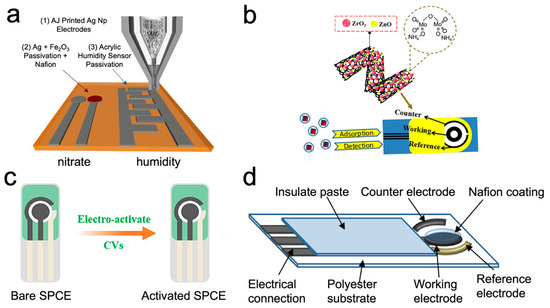 where Ip is the peak current, n is the number of electrons transferred during the redox reaction, A is the surface area of the electrode in cm2, C is the concentration in mol m L−1, D is the diffusion coefficient of the species in cm2s−1, and v is the scan rate in Vs−1. The proportional relation allows for quantification of analytes without a complicated calibration process, making CV a simple and efficient ion sensing method. Recently, CV has been used in numerous applications for detecting nutrients in soil using printed sensor techniques, as shown in Figure 4.