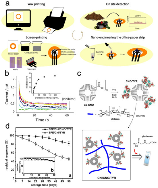 Printed soil amperometry sensors. (a) The illustration depicts the fabrication process, sample test procedure, and signal response of an office paper-based screen-printed enzyme-inhibition amperometric Sensor designed for detecting Organophosphate pesticides; (b) The recorded chronoamperometric data ranges from 0 to 200 ng/mL of paraoxon-ethyl. The inset displays the calibration curve using the same concentration of the inhibitor; (c) the manufacturing process of the Chi/CNO/TYR modified screen-printed sensor utilized for detecting glyphosate herbicide; (d) residual activity graphs demonstrate enhanced stability and repeatability of the sensor with the addition of the nanomaterial CNO. (a,b) Reproduced with permission. Copyright 2021 [53], American Chemical Society. (c,d) Reproduced with permission. Copyright 2019 [77], Springer.
