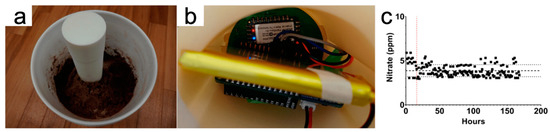 In situ electrochemical soil nitrate sensor sensed by the EIS method. (a,b) Sensor and processing electronic hardware set up in sandy loam soil; (c) In situ EIS measurement over 7 days in soil. (a–c) Reproduced with permission.