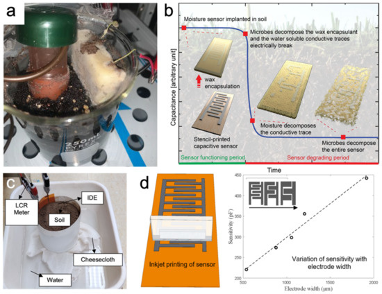 - Sui, Y.; Atreya, M.; Dahal, S.; Gopalakrishnan, A.; Khosla, R.; Whiting, G.L. Controlled Biodegradation of an Additively Fabricated Capacitive Soil Moisture Sensor. ACS Sustain. Chem. Eng. 2021, 9, 2486–2495. [Google Scholar] [CrossRef]