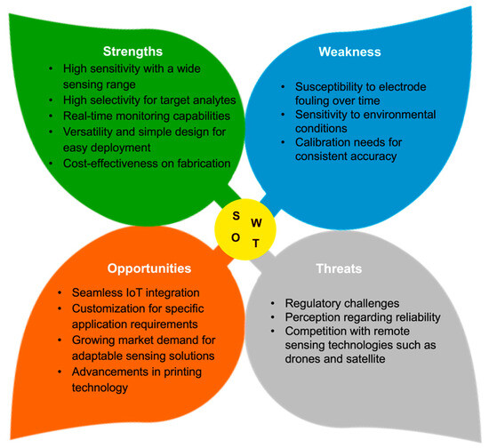 Soil measurements often require deploying a large number of sensors at different sites and depths to provide spatially distributed data across fields [132]. Additionally, there is a need for the development of a communication network to transmit real-time monitoring data from sensors to users. Printed electronics offer benefits such as the possibility of integration with communication electronic units [133,134]. Figure 9 illustrates a SWOT analysis (Strengths, Weaknesses, Opportunities, and Threats) of printed electrochemical sensors for soil sensing applications. Printed electrochemical sensors combine material and mechanical characteristics from printing electronics with strong sensing capabilities from electrochemical sensing, showing great strengths and opportunities in soil sensing.