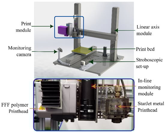Schematic of our hybrid printing platform showing FFF polymer printhead (top) and StarJet printhead (bottom) mounted on a single axis to enable MMAM printing and the inset shows a photo of the print module containing the two printheads. The printer’s printheads are aligned next to each other along the x-axis, facilitating the sequential printing of metal and polymer materials.
