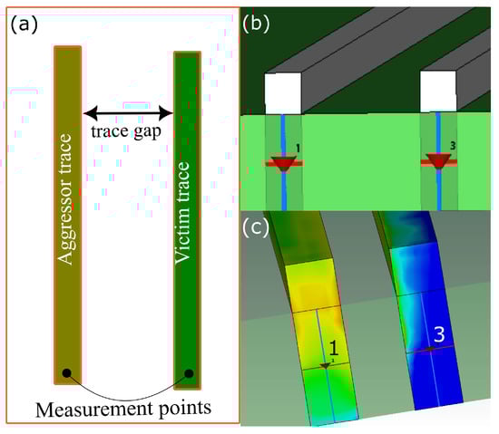 (a) Illustration of the crosstalk measurement set for adjacent metal traces, (b) simulation model showing the aggressor trace as 1 and the victim trace as 2, (c) power flow from the aggressor to victim trace during crosstalk.