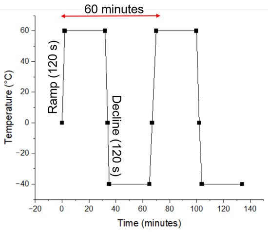 Thermal cycling of the hybrid printed samples was performed between −40 °C and 60 °C with 30 min of dwell time at the lower extreme and 30 min of dwell time at the higher extreme temperature. The temperature change time was fixed at 120 s during both heating and cooling. Thus, a full thermal cycle took 60 min; see Figure 3. The thermal cycling test was run for 100 cycles (in VOETSCH, Voetsch Industrietechnik, Germany). The higher extreme temperature was limited by the heat deflection temperature of PETG (i.e., 85 °C []).