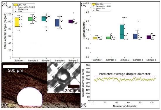 The analytical calculations revealed a maximum spread of the microdroplet as high as 2.2, with a minimum spread of 1. This implies that the maximum possible diameter of a microdroplet, originally (289 ± 28) μm in air, could extend to 634 μm on the polymer surface. However, due to the non-linear relationship between the static contact angle and the spread factor in Equation (5), the predicted sessile metal microdroplet diameter is the average of the diameter from all individual spread factors obtained in Figure 4c times the microdroplet diameter in air ((289 ± 28) μm), as illustrated by the dashed line in Figure 4d.