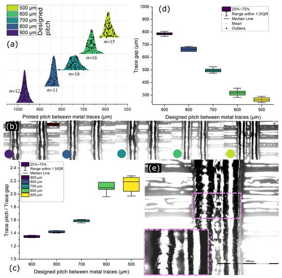 In this investigation, we pursued a methodical approach to ascertain both the minimum traceable pitch (MTP) and the offset between the printed and designed MTP. Our experimental design involved incrementally varying the pitch between traces, starting from 1000 μm, until the point where traces began to ‘short’ with each other. Leveraging insights from previous results regarding microdroplet diameter on polymer substrates, we anticipated the MTP to converge around the value of 341 μm. Figure 5a illustrates the outcomes of our MTP experiment across the x-axis, ranging from 1000 μm to 500 μm, which represents the designed pitch. Beyond this range, at a designed value of 400 μm, shorting between parallel traces became apparent, as depicted in Figure 5e. Consequently, we limited our results display to pitches of up to 500 μm. Notably, the experimentally determined MTP surpassed the predicted value of 341 μm. To clarify this discrepancy, we plotted a prediction curve for the MTP experiment results against their corresponding designed values, revealing an offset of (64 ± 25) μm (see Appendix A, Figure A1). Despite this offset, a substantial difference of 245 μm persisted between the predicted and experimentally achieved MTP, measured at (586 ± 15) μm.