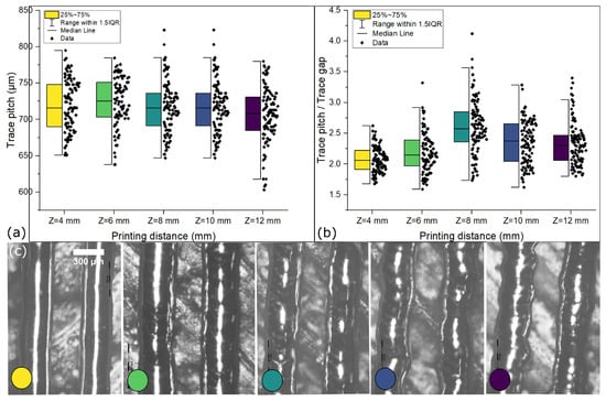 (a) Trace pitch printed at different printing distances, (b) ratio of trace pitch to trace gap for traces printed at different printing distances highlighting the variation induced from variations in trace gap. (c) Microscopic images of traces printed at a design pitch of 700 μm at various printing distances. The color circles on each image correspond to the box colors in (a,b).