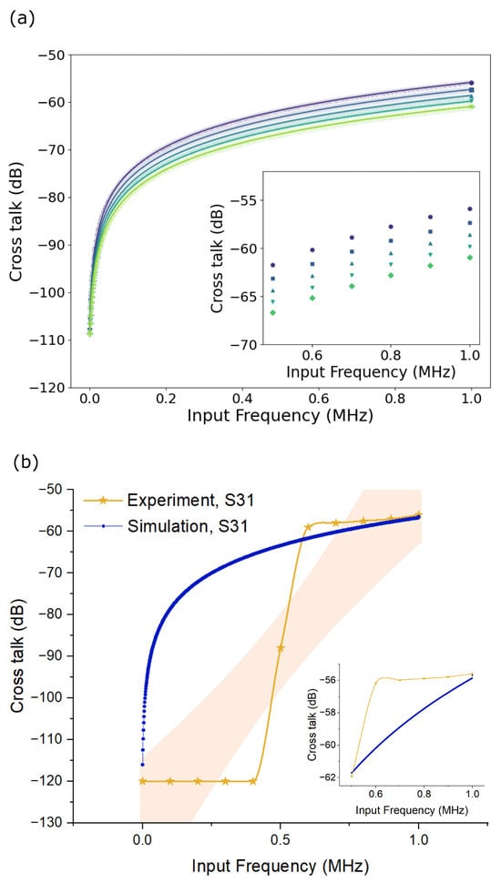 Simulated crosstalk results, depicted in Figure 7a, showcased variations across five different trace gap models. Notably, as the trace gap decreased from a maximum of 781 μm to a minimum of 281 μm, the observed crosstalk between traces increased. At the smallest trace gap of (281 ± 15) μm, the simulated crosstalk at 1000 kHz reached −55 dB. Subsequently, experimental investigations focused on the minimum trace gap obtained during manufacturing trace patterns (MTPs), which was 281 μm. The experimental crosstalk results, as illustrated in Figure 7b, revealed a presence of crosstalk reaching −120 dB up to 600 kHz. This crosstalk, predominantly perceived as noise due to the absence of discernible waveform signals at the victim trace voltage, transitioned into clear waveform signals in the range of −60 dB to −55 dB beyond 600 kHz. Consequently, the findings suggest that traces with widths of (241 ± 12) μm and lengths of 90 mm on a 600 μm-thick PETG dielectric substrate exhibited low resistance ((285 ± 6) mΩ) and experienced limited crosstalk effects, with crosstalk attenuated to −120 dB up to a working frequency of 600 kHz.