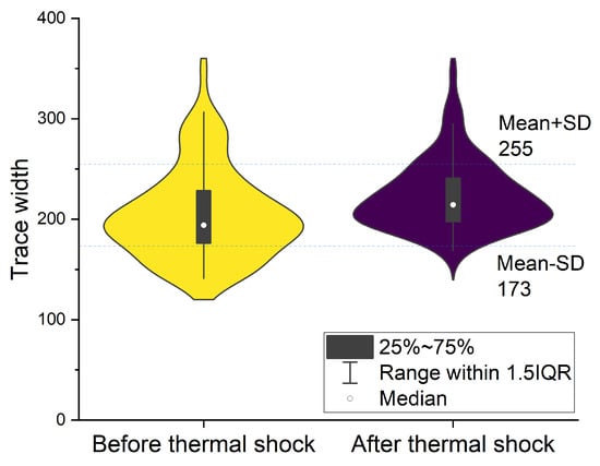 Thermal cycling of the hybrid printed samples was performed between −40 °C and 60 °C with 30 min of dwell time at the lower extreme and 30 min of dwell time at the higher temperature extreme. Thus, a full thermal cycle took 60 min. The thermal cycling test was run for 100 cycles. The effect of thermal shock on printed traces with the above-mentioned defined printing parameters was investigated to assess its impact on trace width and resistance. Upon subjecting the printed traces to thermal shock, we observed a notable change in the mean trace width, increasing from (241 ± 12) μm to (251 ± 16) μm, representing a 4.1% variation, see Figure 8. This change in trace width suggests potential modifications in the polymer substrate and/or the metal traces induced by thermal stress. Remarkably, despite the thermal shock, no detachment of individual traces from the polymer surface was observed, indicating robust adhesion between the metal and polymer components. This favorable adhesion quality suggests promising applications for hybrid printing in the realm of printed electronics, particularly in environments with operating temperatures below 60 °C, leveraging the selected PETG polymer. Furthermore, the ability to modify printing materials by transitioning to polymers with higher glass transition temperatures offers versatility, facilitating the production of both undisturbed electrical traces and polymer components in integrated systems. Such findings underscore the adaptability and potential market applications of hybrid printing technologies in diverse electronic and engineering contexts.