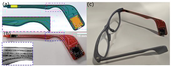 (a) CAD model of the smart eyeglass arm, highlighting the point of interest where traces must be printed according to MTP results (inset shows the magnified section of the arm of eyeglass where customized traces are designed which take the shape of the frame), (b) printed model of the smart eyeglass arm with traces printed according to MTP at the highlighted point of interest region (see inset), (c) a full smart eyeglasses model with electronics interconnected to the printed metal traces.
