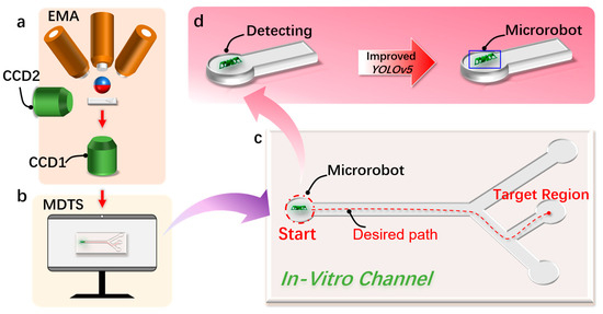 The detection and tracking schematic diagram of the magnetically controlled micro-medical robot based on deep learning. (a) A schematic diagram of the electromagnetic drive (EMA) system that drives the magnetically controlled microrobot to generate motion in the region of interest (ROI). (b) This is used to realize the schematic diagram of the microrobot target detection and motion tracking (MDTS) system. (c) The microrobot moves to the target position in the external orbit driven by the EMA system and uses MDTS to detect and track the trajectory of the microrobot. (d) Using the improved YOLOv5 target detection algorithm based on deep learning to realize the detection of the microrobot.