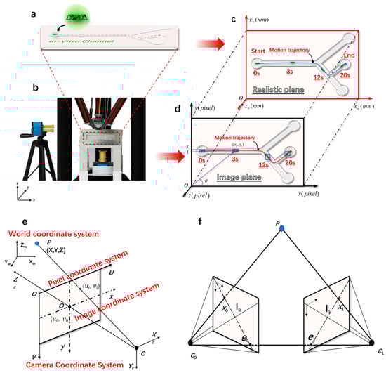 The imaging principle of magnetically controlled microrobots based on a binocular vision algorithm. (a) Customized microrobot motion trajectory. (b) Magnetically controlled binocular imaging and tracking experimental device. (c) A real plane diagram of the monocular target tracking algorithm. (d) An imaging plane diagram of the monocular target tracking algorithm. (e) The geometric model of camera imaging and the spatial distribution map of the four coordinate systems established. (f) The polar geometry of two corresponding camera images.