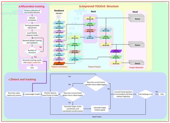 A schematic diagram of the imaging and tracking principle of the YOLOv5 magnetically controlled microrobot based on deep learning. (a) The improvement of the YOLOv5 network framework and the training diagram of the magnetically controlled microrobot model. (b) Loading the trained robot weight model file into the tracking phase to realize the detection and tracking of the experimental microrobot. (c) The real-time detection and tracking process of the microrobot.