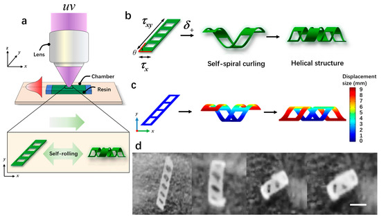 Microrobots were manufactured from direct patterning and visual optical systems, as shown in Figure 4a. The fabrication process of the microrobots was as follows: First, we took two transparent glass slides with an area of 24 × 24 mm and 20 × 20 mm, and then double-sided tape (thickness: 100 mm) was sandwiched between them to form a microchamber. Next, a biocompatible solution was prepared by mixing 50 wt% e-dent 400 and 50 wt% MMP using a Thinky Mixer (Nano Tech, Inc., Daejeon, Republic of Korea) at a speed of 2000 rpm for 30 min. Once the microchamber was prepared, a syringe was used to inject the biocompatible solution directly into the microchamber using capillary force. Subsequently, the microchamber was placed in a sample box and polymerization was carried out under ultraviolet light (λ = 365 nm) for 3.2 s. Previous studies [27] have demonstrated that the curvature of microrobots is maximized when the ratio of the soft layer to the hard layer is 8:2, resulting in a more stable self-curling structure. Exposed samples were placed in a culture dish filled with isopropanol (IPA) and covered with aluminum foil for 2 h. Afterward, the glass slide and tape were taken out, and direct cleaning with isopropanol was performed to remove the unpolymerized ink. The patterned film remained on the lid glass. Finally, a few minutes later, the patterned film self-separated and curled relative to the initial design, as shown in Figure 4d and Supplementary Video S1. When the oblique film (θ < 90°) was exposed to proton stimulation (δ+), torque was generated due to the different lengths along the x-axis and y-axis, resulting in asymmetric folding. This folding caused the film to form a spiral structure (Figure 4b). Figure 4c illustrates the simulated rolling phenomenon occurring over time under exposure to proton stimulation (δ+). Initially, the rolling angle of the film was 0° (φ); as time passed, the rolling angle (φ) increased to 360°, finally forming a spiral structure. In addition, the air hole in the design played a crucial role in the generation of the spiral structures. If there were no air holes, the generated torque would tilt, resulting in the formation of a cylindrical structure.