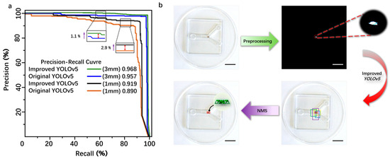 From Figure 5a, it can be seen that the area below the P–R curve of the improved YOLOv5 model is slightly larger than that of the original YOLOv5 model, indicating that the improved YOLOv5 model has a higher average precision (AP) than the original model. The detection process of the microrobot target by YOLOv5 is as follows: First, the camera captures images of the microrobot and preprocesses them by changing the image size to the YOLOv5 detection size of 640 × 640 × 3 for subsequent detection. Then, the image is binarized to reduce the interference from background information. Next, the image is input into the improved YOLOv5 neural network framework for detection. Finally, after non-maximum suppression (NMS) processing, detection boxes with low intersection over union (IOU) values are removed, leaving only the detection box with the maximum IOU value to achieve the detection of the microrobot. The IOU threshold for this experiment is set to 0.7 to filter out detection boxes with low IOU values during the detection process, ensuring that the detection boxes can match the target to the maximum extent, as shown in Figure 5b.