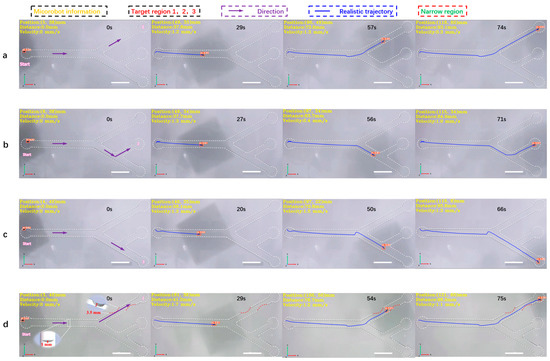The 2D detection and tracking experiment of the magnetically controlled microrobot based on YOLOv5. (a) The microrobot moves to target area 1. (b) The microrobot moves to target area 2. (c) The microrobot moves to target area 3. (d) The microrobot passes through an obstacle with a height of 1 mm, through two narrow areas, the width of which is 3.5 mm, and moves to target area 1 to simulate the thrombus deposited on the inner wall of blood vessels. In this experiment, the main diameter of the vascular model was 6 mm and the diameter of the branch was 5 mm. All parameters simulate the establishment of human hepatic veins. Scale bar: 10 mm.
