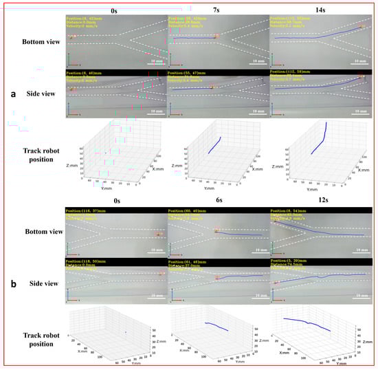 During the experiment, challenges arose in the detection and tracking of microrobots due to interference from lighting and the electromagnetic driving system in the captured images, especially with one camera positioned at the bottom of the experimental track (Figure 2b). To address this issue, a 3D-printed white background model with dimensions of 200 mm × 200 mm was created and placed on top of the experimental track to reduce interference and enhance detection accuracy. When designing the 3D tracking experiments, the initially customized 3D vascular model served as a navigation track and was positioned inside the model. Due to limitations in the light-curing printing equipment, the prepared inner surface of the track could not achieve absolute smoothness and polishing, resulting in a relatively poor imaging effect for microrobots. Consequently, we redesigned the 3D vascular model, placing the track inside a transparent groove with dimensions of 150 mm × 75 mm × 53 mm to address the issue of uneven surfaces within the track. When injecting DI water into the groove, the rapid injection speed led to the swift filling of the track, preventing residual air from escaping, and resulting in the formation of bubbles. Even bubbles with a diameter of 1 mm could interfere with the detection of microrobots when observed by the camera. To address these issues, the solution involved controlled DI water injection using a modified syringe and allowing the experimental track filled with DI water to stand for 30 min. This approach maximized the removal of air bubbles within the track, minimizing their impact on the imaging of the microrobots. Initially, our experimental design involved placing two cameras parallel to each other at the bottom of the track. However, due to the imaging range of the cameras being limited to 200 mm × 200 mm, the captured images displayed an incomplete view of the track. As a solution, adjustments were made to the camera’s focal length and the distance between the camera and the track. During the adjustment, it was discovered that to capture the complete track information on the imaging plane, the track needed to be elevated. However, the movement space of the entire electromagnetic driving system was limited. Elevating the track would compress the movement space of the electromagnetic coils, preventing its movement. To address this issue, the experiment was optimized by placing one camera on the side of the track and another at the bottom (Figure 2b). This solution resolved the issue of an incomplete track display in the captured images. During the detection and tracking of microrobots, no instances of missed detections or false detection were observed, and the calculated precision of the microrobot’s positions remained satisfactory.