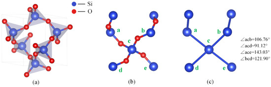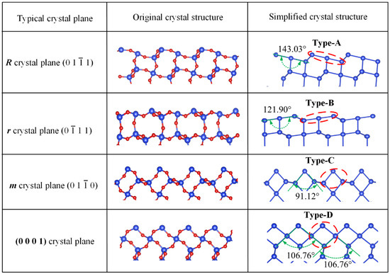 Figure 2a depicts the structure of a single quartz unit cell, wherein each Si atom is bonded to four oxygen atoms, forming a tetrahedron. Further analysis revealed that each oxygen atom composing the quartz unit cell is consistently positioned between two Si atoms, arranged predominantly in two fixed molecular chains (-Si-O-Si-O-) (as depicted in Figure 2b). This specific arrangement results in varied etching rates along crystallographic directions [26]. To visualize the etching process of quartz crystals at the atomic layer level, some researchers have simplified the quartz unit cell structure by removing all oxygen atoms and connecting Si atoms via chemical bonds to create a simplified version of the quartz unit cell (as shown in Figure 2c). Subsequently, they have employed Monte Carlo methods to simulate the etching morphology of Z_cut quartz substrates [25]. This simplified model, by disregarding the oxygen atoms within the quartz unit cell, greatly simplifies the arrangement of quartz crystal atomic structures while retaining the overall structural type of the quartz unit cell. Specifically, it removes oxygen atoms, but the spatial positions of silicon atoms and the crystal cell structure remain unchanged. Given its successful application in etching simulation methods, this model provides a feasible crystal cell simplification scheme and reduces the difficulty of analyzing different crystal planes at the microscopic atomic level. By constructing this simplified unit cell model, this study identified that the bond angles between Si-Si bonds predominantly manifest in four forms: 91.12°, 106.76°, 123.9°, and 143°, as depicted in Figure 2c. Based on this observation, this study hypothesized that bond angles formed by surface atoms on crystal faces correlate with these angles, and various crystal plane characteristics emerge from the combinations of these bond angles.
