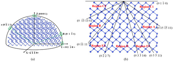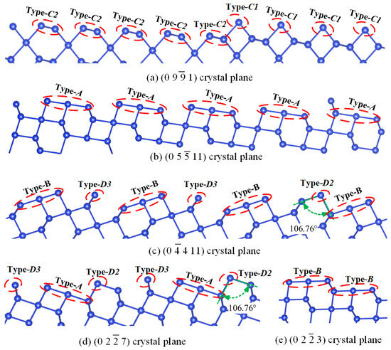 Builds upon the analysis conducted in Section 2.1 and Section 2.2 to examine the common characteristics of various typical crystal planes (R, r, m, and (0001)) and their neighboring regions by employing a method of dividing atomic groups’ structure. It then extends this method to other crystal planes or regions to construct intrinsic connections between different crystal planes. To validate this speculative hypothesis, the crystal planes within the quartz X_cut type were analyzed. This cut type was primarily chosen because it is relatively easier to obtain and, compared to the Z_cut type, has a wider range of crystal plane etching rate data and includes typical quartz crystal planes, as shown in Figure 5a. By dividing the surface atoms of the crystal planes within the X_cut type into atomic groups (Figure 5b), this study found that all crystal planes within this region can be represented by one or two atomic groups or sub-atomic group structures from the typical crystal planes in Figure 3, either individually or in combination. For example, the crystal plane in Figure 6a can be composed of one atomic group, Type-C, which includes sub-atomic groups Type-C1 and Type-C2. Similarly, the crystal plane can be composed of a mixture of Type-A and Type-D atomic groups or sub-atomic groups. Therefore, this method of partitioning crystal planes based on bond angle characteristics demonstrates its feasibility. Furthermore, by analyzing common features in surface atomic group configurations of crystal planes within the X_cut orientation, these crystal planes were classified into seven regions. The surface atomic arrangement of each region’s crystal planes can be represented by the same type of atomic group or sub-atomic group configuration, either individually or in combination. Hence, the atomic group configurations in each region’s crystal planes are essentially consistent. For example, the surface atomic arrangements of all crystal planes in Regions A and B can be represented by atomic group configurations Type-A and Type-B, respectively (as shown in Figure 6b,e). The surface atomic arrangements of all crystal planes in Regions C1 and C2 can be represented by atomic group configuration Type-C (as shown in Figure 6a). Likewise, the surface atomic arrangements of all crystal planes in Region D are primarily composed of atomic group configuration Type-D. The surface atomic arrangements of crystal planes in the Regions E1 and E2 regions are represented by a mixture of Type-D and Type-A or Type-B atomic groups (as shown in Figure 6c).