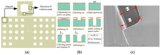 To obtain etch rate data for quartz crystal planes, a 2 mm square mask with rotational direction markers was designed on the surface of X-cut quartz wafers, as shown in Figure 7a. This mask design allows for obtaining etch rate information for four crystal planes simultaneously, providing convenience for subsequent measurements. Rotating the square mask counterclockwise in 5° increments provides additional etching rate data for crystal orientations within 360°. The specific experimental process for obtaining the etch rate of crystal planes is depicted in Figure 7b. In this study, the thicknesses of the Au and Cr sputtered masks were 60 nm and 200 nm, respectively. Deep reactive ion etching (DRIE) technology was utilized to etch through the quartz wafer, resulting in well-defined vertical sidewalls. For the wet etching process, a saturated NH4HF2 solution was employed as the etchant for the quartz wafer with a thickness of 100 μm, which was immersed in an 80 ± 2 °C water bath for one hour. Notably, no stirring apparatus was utilized in the experimental procedure of this study. Figure 7c shows details captured by a scanning electron microscope (SEM) after etching the quartz wafer. The etch rate of the crystal faces can be calculated by measuring and recording the L1 and L2 positions in Figure 7b (V = (L1 − L2)/T, where T is the etching time). To reduce measurement errors, the etched morphologies of the two sets of identical masks in Figure 7a were measured individually, and the average value was used as the final etch rate data for each crystal plane.