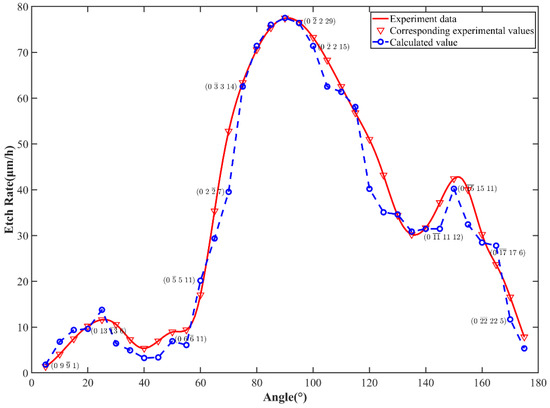 Given the analysis of the etching mechanism in Section 2.2, it can be inferred that the etching process on crystal planes can be seen as repetitively removing specific types of atomic groups. Consequently, if a basic crystal plane can be identified to measure the detachment rate of the type of atomic groups, the etching rates of various crystal planes can be calculated using geometric parameter differences from planes with identical surface atomic configurations. The etching rates of crystal planes with the same surface atomic configuration can be obtained by this method. As shown in Figure 5b, the crystal planes within the Regions A and B can each be represented by atomic groups on R and r planes (referred to as Type-A and Type-B, respectively). Therefore, they can serve as the basic crystal planes for this region. Utilizing Equation (1), the detachment rates of Type-A and Type-B atomic groups can be solved, and based on geometric parameter information among different crystal planes within this region, equations for the etching rates of other crystal planes within Regions A and B can be constructed. When the crystallographic direction Y rotates clockwise by 5° around X, all crystal planes within Regions E1 and E2 are captured. Crystal planes composed of Type-D atomic groups, initially appearing in a mixture with Type-A or Type-D, serve as the basic crystal planes within this region, namely, and planes. It is worth noting that the arrangement of atomic configurations in quartz crystal results in the m and (0001) crystal planes having more regular surface atomic structures compared to other planes. Microscopically, completing one cycle involves etching two or three layers of surface atoms, which is not a reasonable method for determining etching depth. This is mainly because the (0001) plane, although typically representing the fastest etching direction [10], only etches three layers of surface atoms. Conversely, the etching rate of the R crystal plane is significantly slower than that of the (0001) plane, necessitating the etching of 42 layers of surface atoms to complete one cycle. This characteristic goes against basic physical intuition. Therefore, although the m and (0001) planes can serve as basic crystal planes for analyzing atomic groups Type-C and Type-D, they do not effectively reflect microscopic geometric etching depth information. For this reason, neighboring crystal planes, and , respectively, were selected as the basic crystal planes for Regions C1 and D, thus obtaining etching rate information for Type-C1 and Type-D. A similar approach was employed in selecting the plane as the basic crystal plane for Region C2.