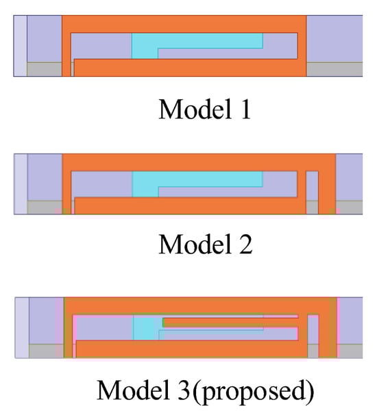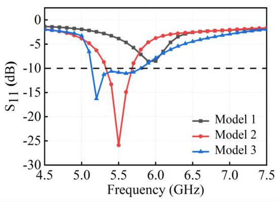 Since the radiating patch on the inner side of the vertical dielectric substrate is directly connected to the ground plane, altering its structure significantly impacts impedance matching. To extend the operational bandwidth, radiating patches of different lengths are constructed on the outer side of the vertical dielectric substrate, thereby creating different current paths. Initially, a rectangular loop structure comprising two inverted L-shaped coupling branches is constructed. The inner L-shaped branch feeds the outer rectangular loop structure through substrate coupling, exciting only one resonant mode at 5.9 GHz. However, the return loss is less than 10 dB, reflecting inadequate impedance matching and reduced radiative efficiency. In order to improve the impedance matching, Model 2 is designed to resonate at the 5.5 GHz by adding an inverted L-shaped branch to the outer side of the rectangular loop, which operates a frequency band of 5.33–5.68 GHz (S11 < −10 dB) and has a bandwidth of approximately 6%. To create more additional resonant modes and further increase the impedance bandwidth, Model 3 attempts to add an I-shaped coupling branch within the rectangular loop of the primary radiating element. This structure introduces resonant points at 5.2 GHz and 5.6 GHz, thus exciting two resonant modes and thus increasing the bandwidth of the antenna.
