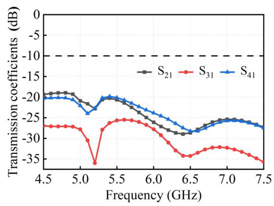 The simulated transmission coefficients of the proposed 4 × 4 MIMO antenna by HFSS are shown in Figure 4. The orthogonally arranged antenna pairs achieve radiation diversity, thereby reducing mutual coupling between antenna elements and enhancing channel isolation without using any decoupling structures. It can be observed that within the operating band of 5.13~5.80 GHz (S11 < −10 dB), the isolation of S21 is superior to 20.25 dB, S31 is better than 25 dB, and S41 is better than 20.11 dB, ensuring excellent isolation performance between adjacent antennas.