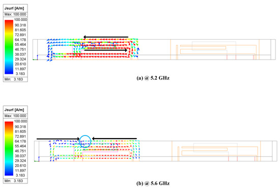 To elucidate the operational principle of the proposed 4 × 4 MIMO antenna, the current models and the current distribution of one antenna element are analyzed. Figure 5 shows the simulated current models of the proposed MIMO antenna at 5.2 GHz and 5.6 GHz. The surface current model is related to the antenna’s resonant behavior, directly affecting the operating state.