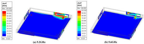 Simulated surface current models of the proposed antenna element 1. (a) 5.2 GHz; (b) 5.6 GHz.