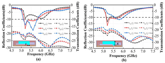 Simulated S parameters of the proposed antenna with different values of the L-shaped branch in the inner radiating elements. (a) fw; (b) fl2.