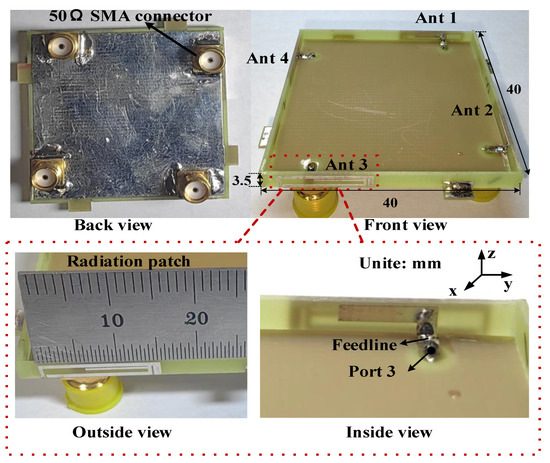 To comprehensively demonstrate the performance of the proposed 4 × 4 MIMO antenna system, the antenna is fabricated and assembled. A prototype was fabricated as shown in Figure 9. The ground plane was soldered onto the backside of the horizontal dielectric substrate, the four vertical sides were connected to the ground plane through solder joints, and SMA connectors were added at the four ports for antenna performance testing. To validate the feasibility and practicality of the proposed antenna, the primary parameters were both simulated and measured. Due to the symmetry of the antenna layout, only the simulation and measurement results when port 1 was excited are given in this Section.
