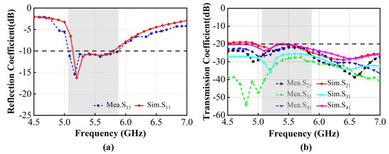 The simulated and measured S-parameters of the proposed 4 × 4 MIMO antenna system are shown in Figure 11. Due to the symmetry of the antenna structure, only the reflection coefficient and transmission coefficients of port 1 are presented. The S-parameters of the antenna were simulated based on HFSS, and the S11 and S21 measurement results of were obtained using a ZVA67 vector network analyzer. Some frequency shifts occurred between the simulation and measurement data, which can be attributed to manufacturing error, the soldering quality of the SMA connectors, the FR-4 substrate dielectric constant variations at different frequencies, and electromagnetic interference in the testing environment. As illustrated in Figure 11a, the measured reflection coefficient results indicate that the antenna achieves a −10 dB impedance bandwidth of approximately 15% (5.06–5.88 GHz), whereas the simulated reflection coefficient results show a −10 dB impedance bandwidth of about 13% (5.13–5.80 GHz), which effectively covers 5G partial LTE band 46 (5.15–5.95 GHz) and 5 GHz Wi-Fi 6E band (5.150–5.825 GHz). According to the measured transmission coefficient results in Figure 11b, the isolation between antenna element 1 and element 2 is better than 21 dB; the isolation between antenna element 1 and element 3 is greater than 27 dB; and for antenna element 1 and element 4, the isolation in the operating band is better than 21 dB, which indicates that the designed antenna exhibits excellent isolation characteristics between different antenna elements.